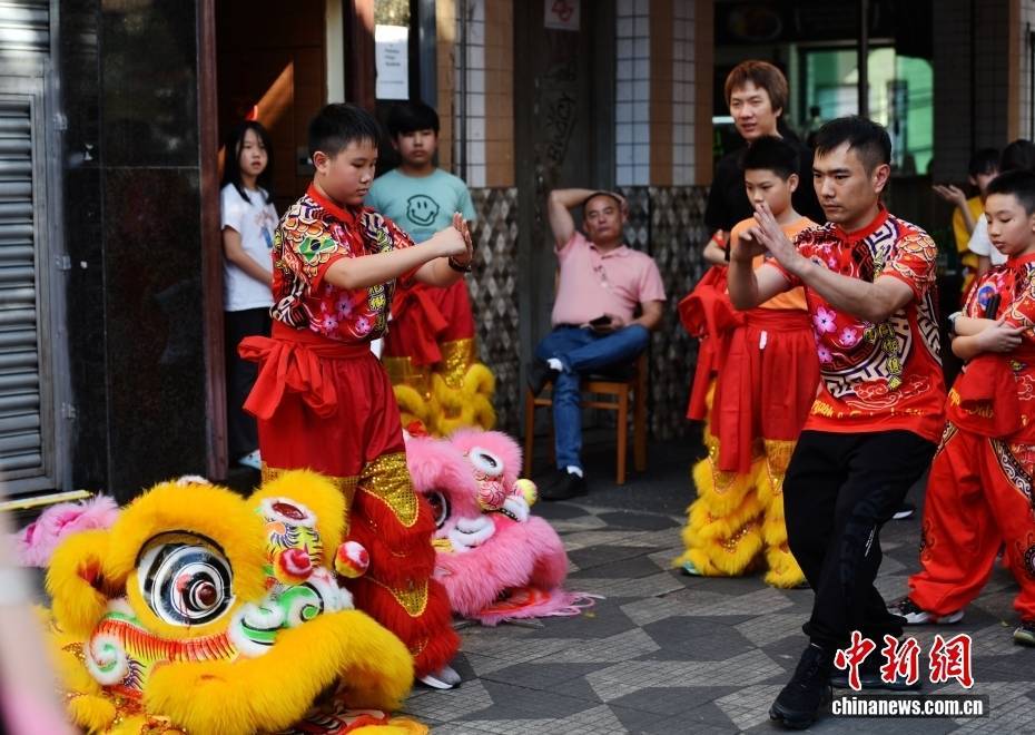 在巴西最大城市圣保罗,巴西人组建的功夫学校大多设有醒狮团和舞龙队,有近二三十支队伍。凡华社举行重大节庆、华商门店开张、长者贺寿,邀请醒狮演出必不可少。巴西广东同乡总会曾于1998年组建过醒狮团,因人员凋零停滞了12年。今年6月,巴西广东同乡总会重组了巴西第一个“师傅、徒弟、鼓手、锣手全是华侨华人”的全华班龙狮团,30余名学员是9岁到14岁的侨二代、侨三代。图为10月25日,巴西圣保罗,来自广东台山朱沙湾的华侨朱志国(右)担任总教头,在巴西广东同乡总会会馆前向13岁的“狮头”苏焯越(左)传授采青礼仪。中新社记者 林春茵 摄